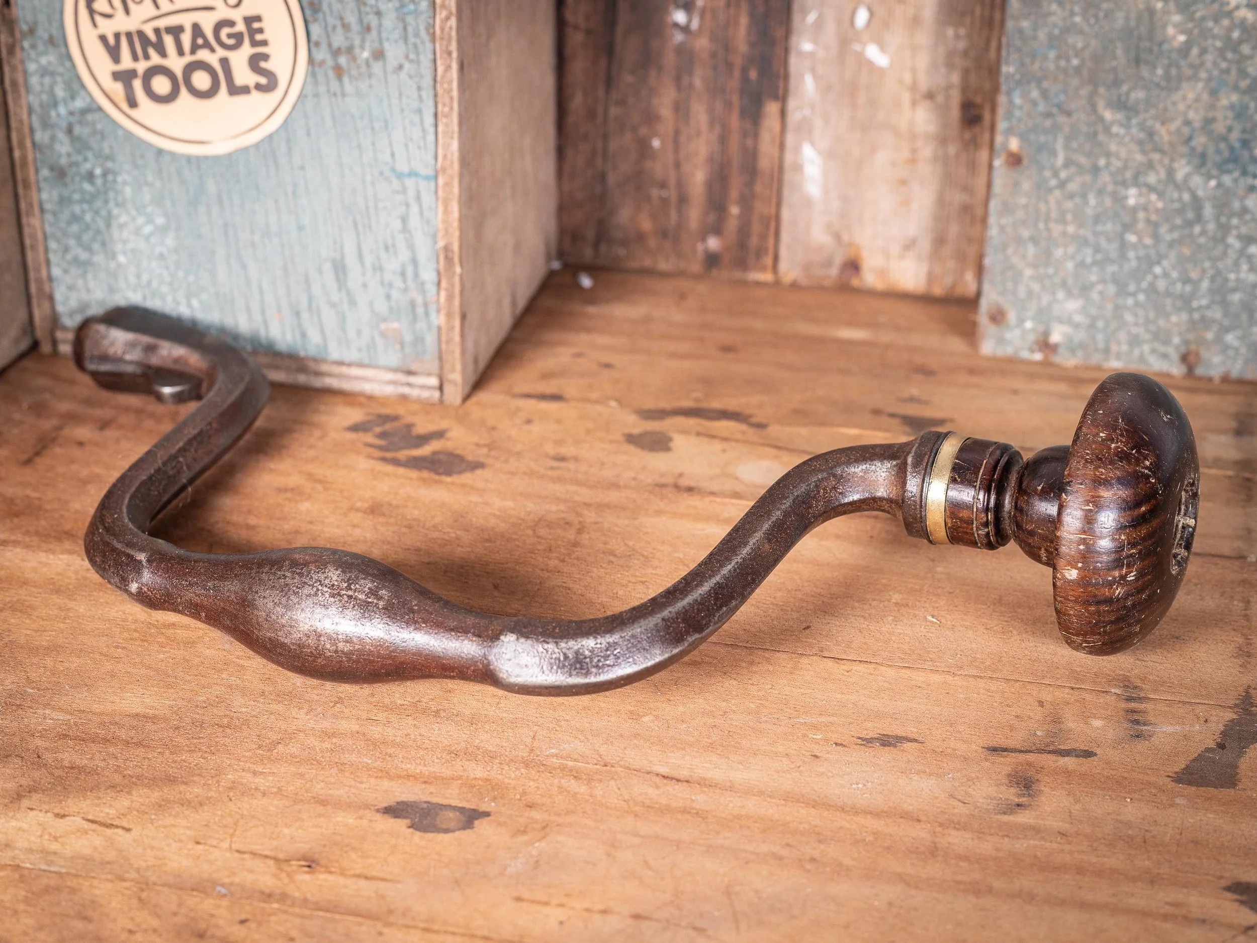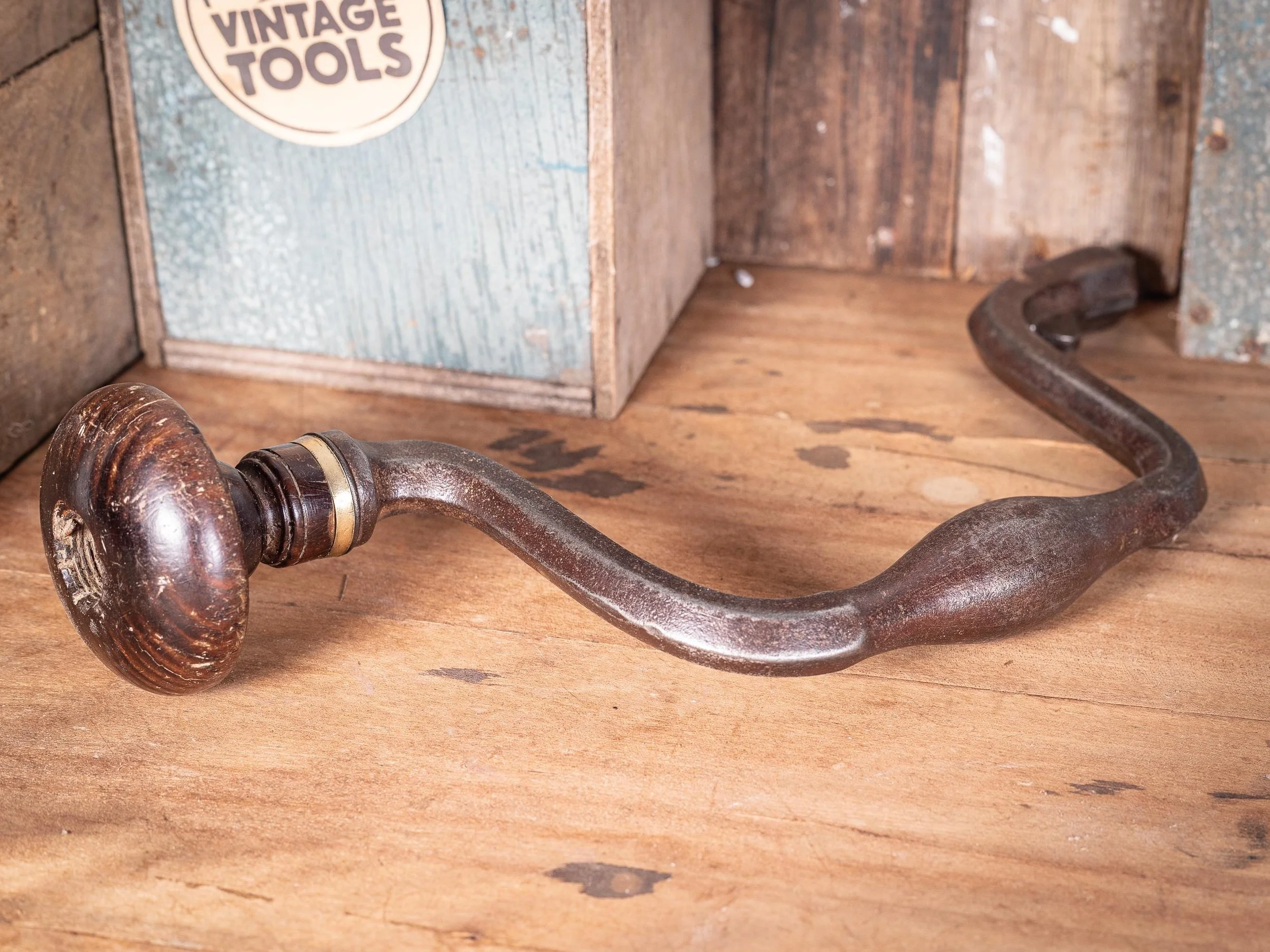 This hand brace has been lightly cleaned to preserve its original patina, reflecting the quality craftsmanship of the era. Although it shows some signs of age-related wear, it remains in good antique condition with honest patina to the metalwork. The wooden handle is solid with attractive natural aging. Mechanism moves freely.