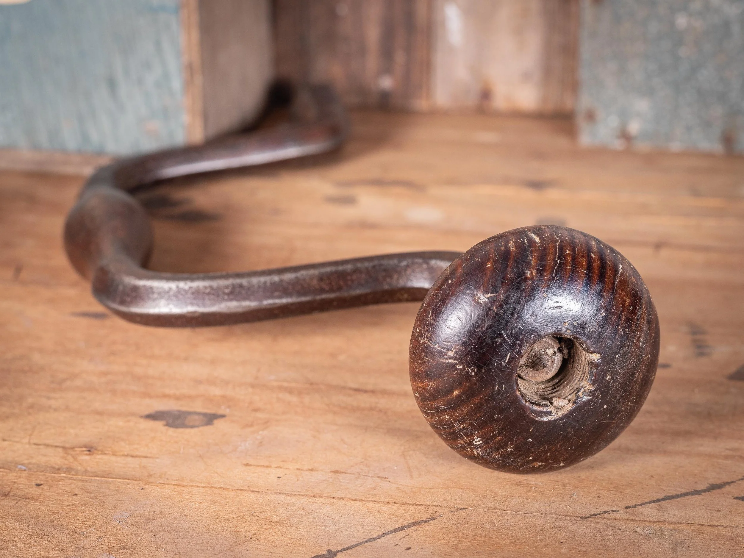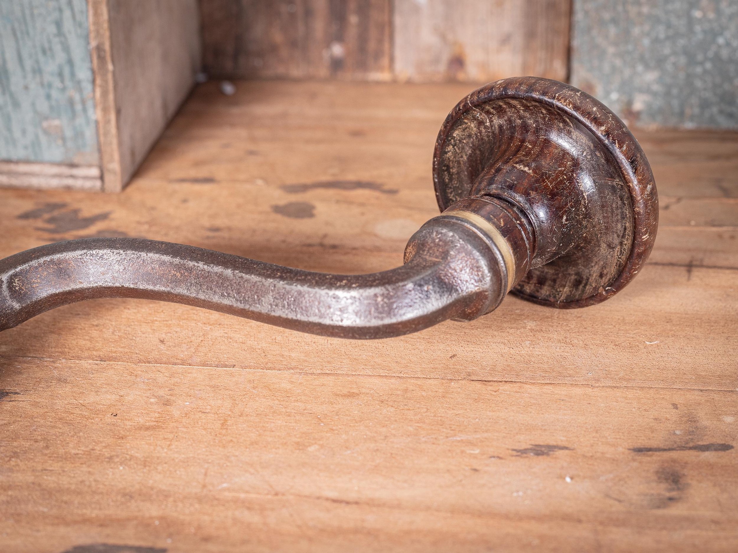 A characterful antique hand brace with swept crank handle and turned wooden grip. Made with a wrought iron frame, with a hardwood handle and brass ferrule.